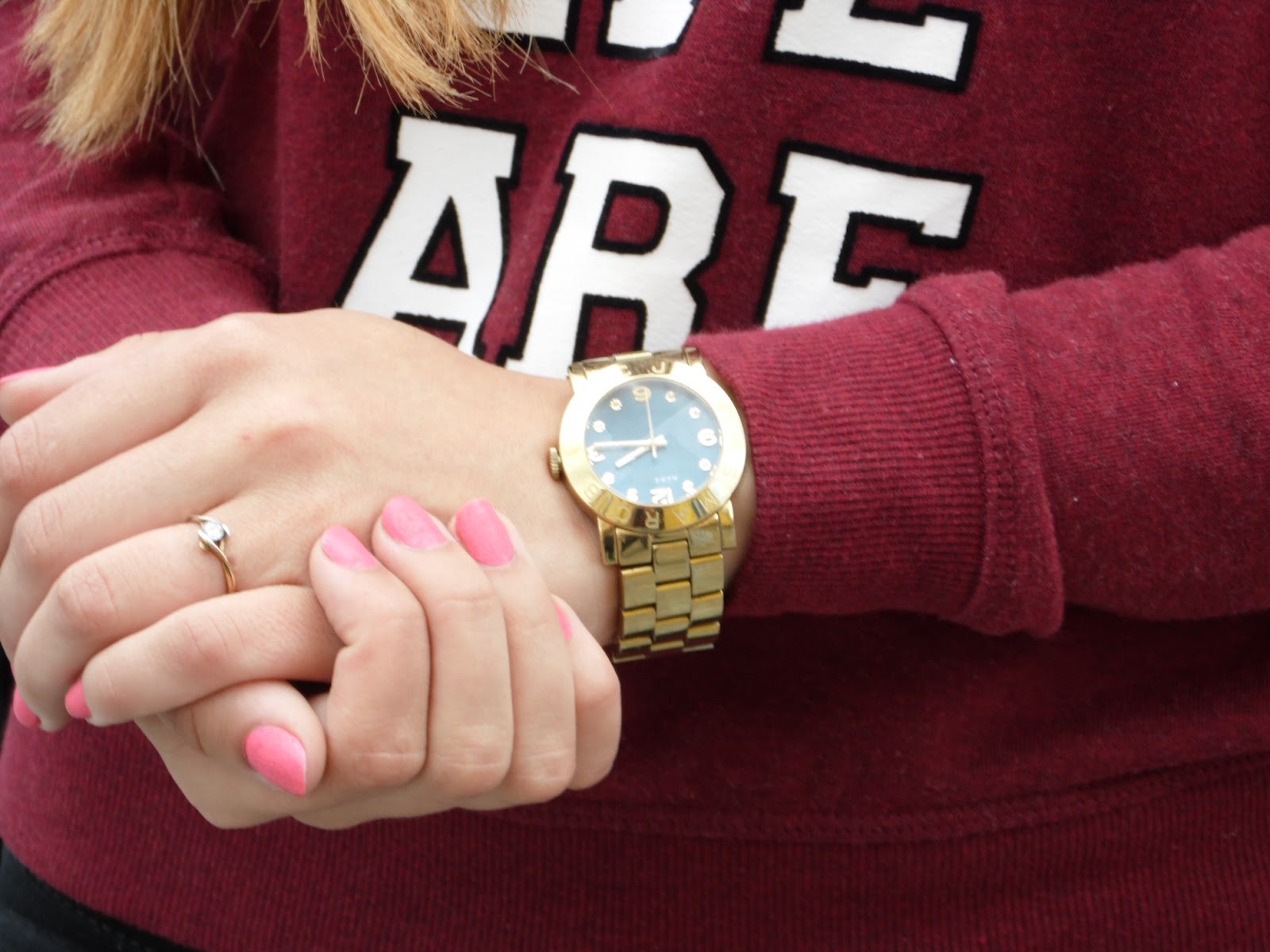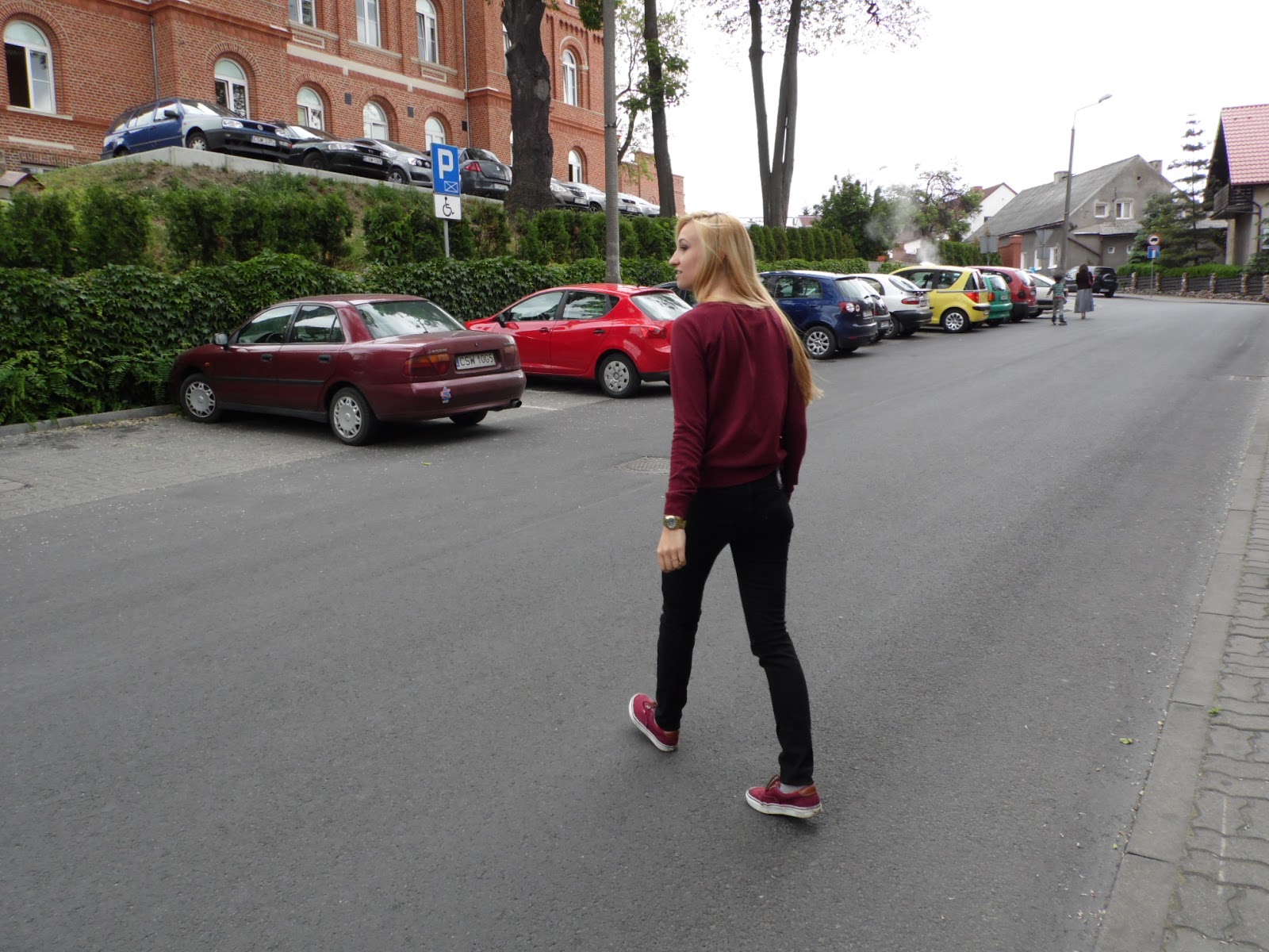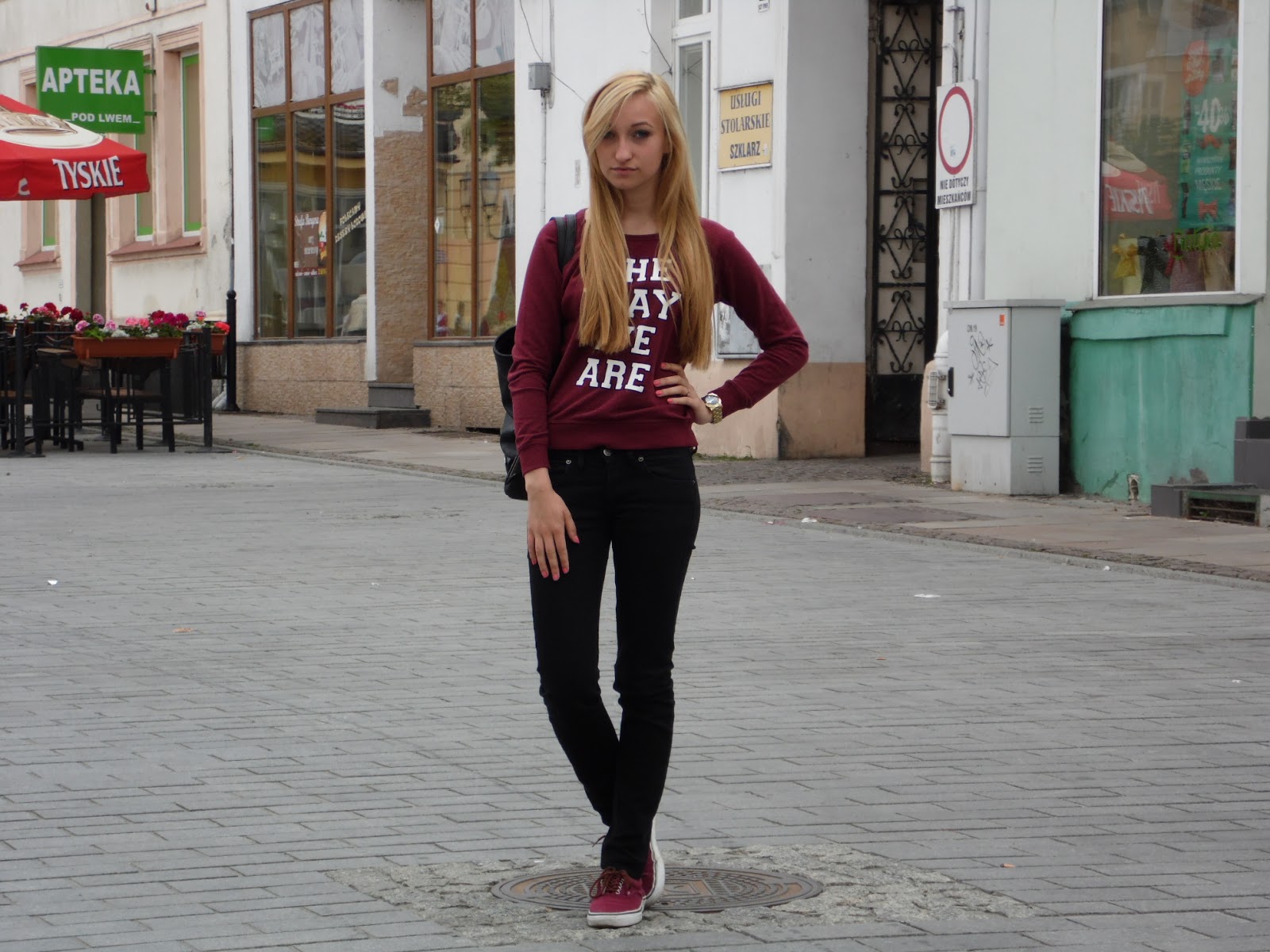 Do czarnych spodni, dobrałam bluzę w moim ulubionym odcieniu czerwieni. Do tego vansy, które niedawno kupiłam. Ponieważ tego dnia wybierałam się do szkoły na moim ramieniu widać torbę, no i zegarek – bez tego wszędzie byłabym spóźniona!