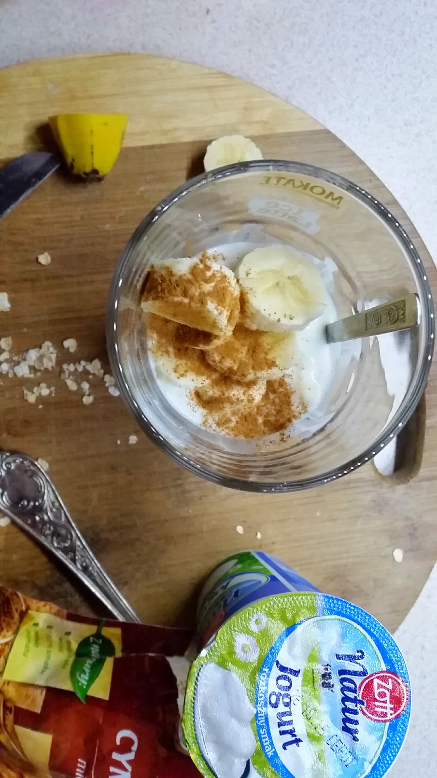 W blenderze umieszczamy banana pokrojonego w plasterki, dodajemy płatki. Miksujemy wszystko na gładką masę. Następnie dorzucamy łyżkę miodu, jogurt, cynamon i mleko. Miksujemy. Przelewamy do szklanki. Posypujemy cynamonem. Gotowe.