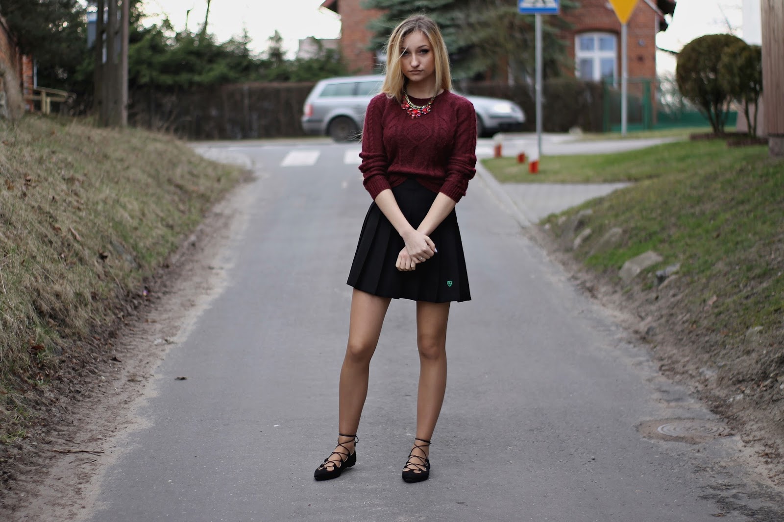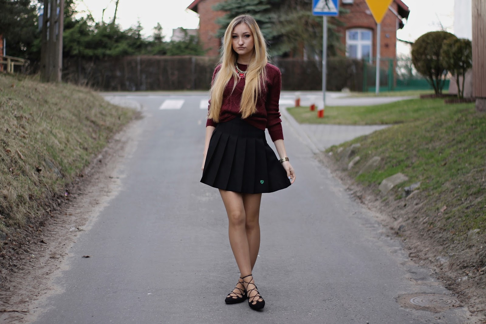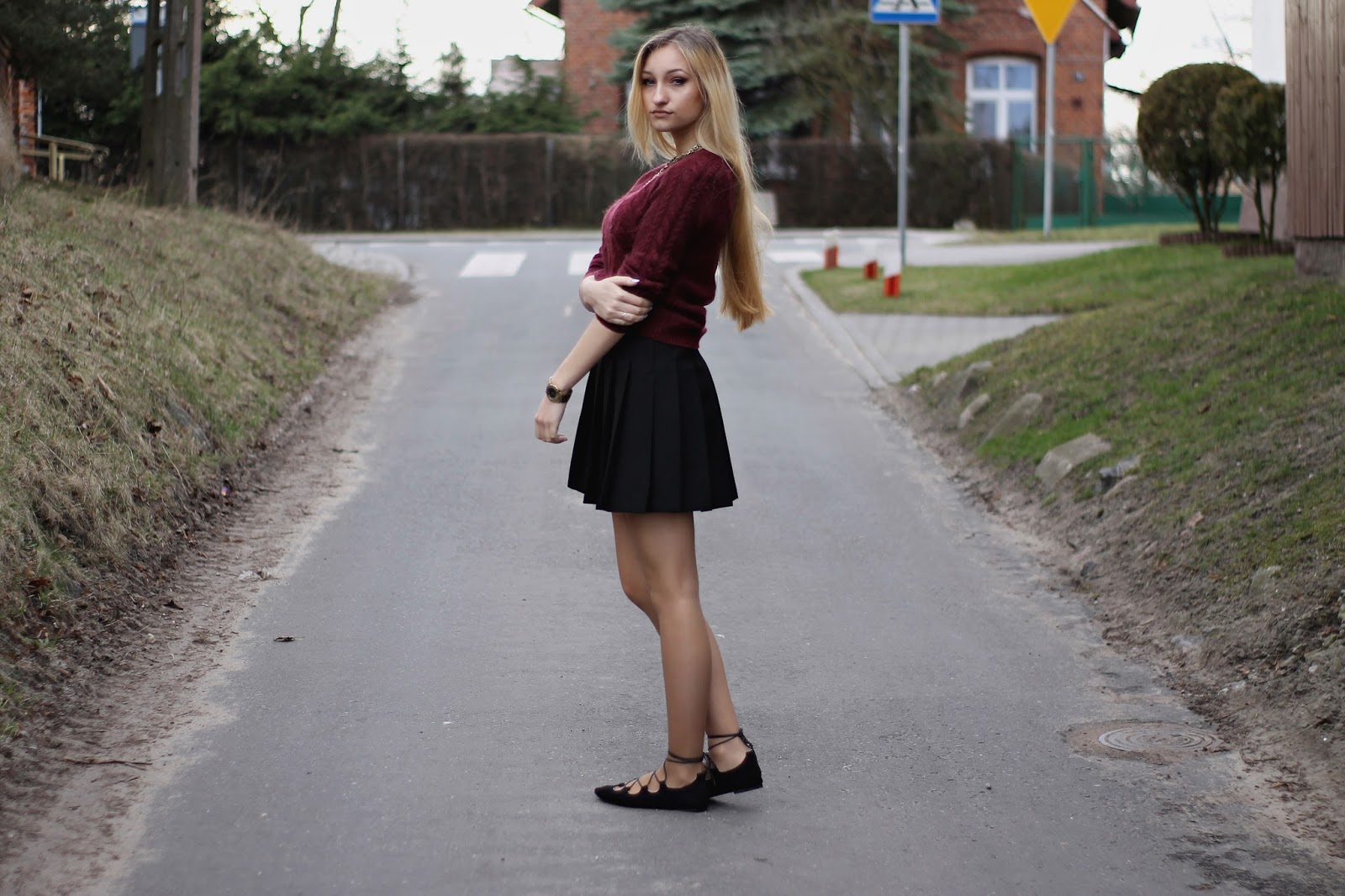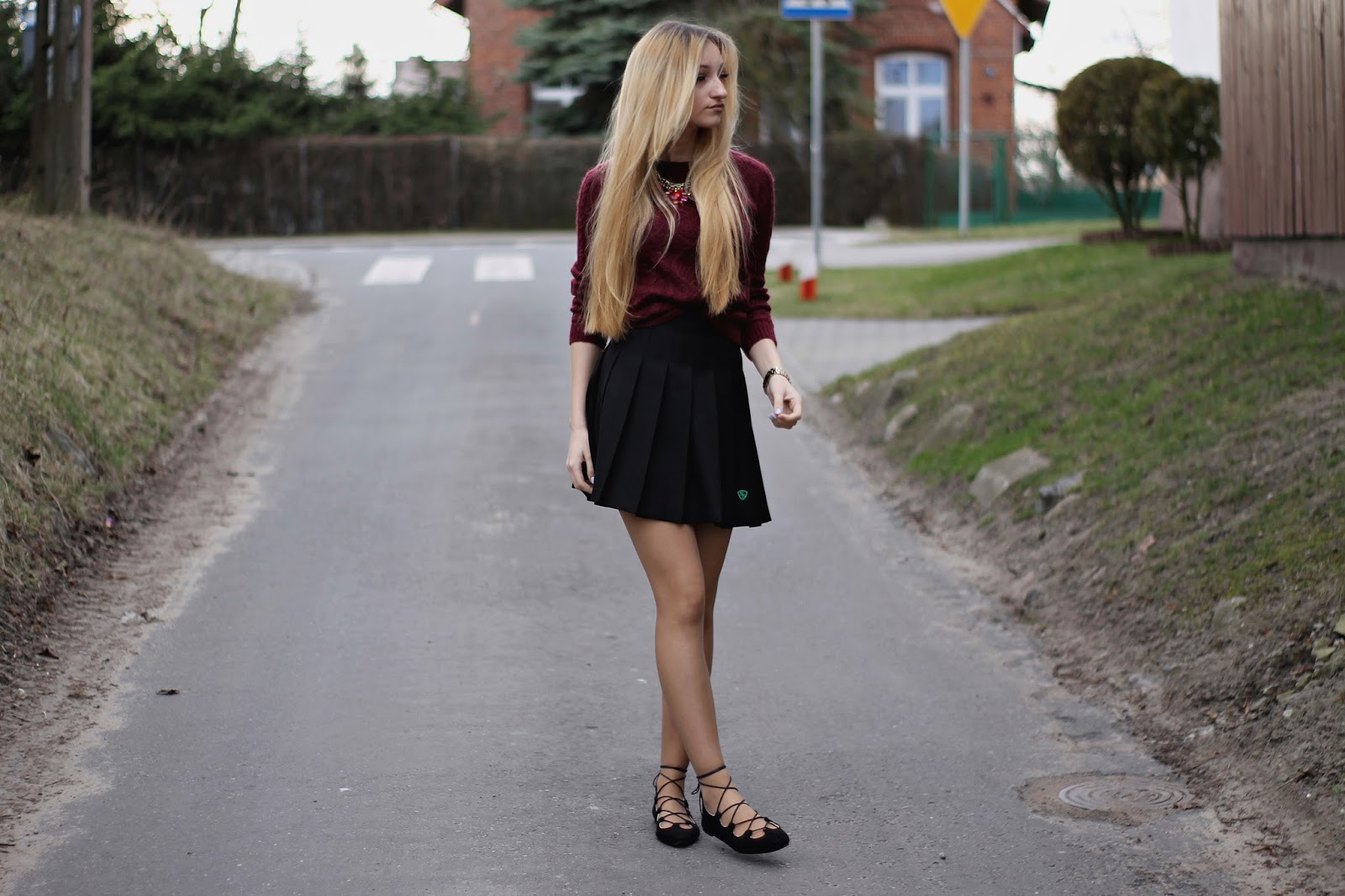 Dzisiejszy post nie jest typowym wielkanocnym postem ze zdjęciem potraw i ozdób na stole. Uważam, że tego i tak na blogach jest pełno, a ja chcę pokazać wam kolejną stylizację. Mój chłopak uważa, że wyglądam jak uczennica 🙂 Może dlatego, że spódniczka to część Angielskiego mundurka. Do tego ubrałam mój bordowy sweter z Zary i cudowne wiązane baleriny z TEGO sklepu. Czy nie są piękne? Gwarantuję wam, że tej wiosny będą bardzo modne, więc tym dziewczynom, które gonią za modą gorąco polecam je już kupić. A te, które chcą je mieć tańszym kosztem polecam zrobienie ich samemu. Na youtube jest pełno toutorialów jak je zrobić. Wystarczą czarne baleriny i sznurek/rzemień.