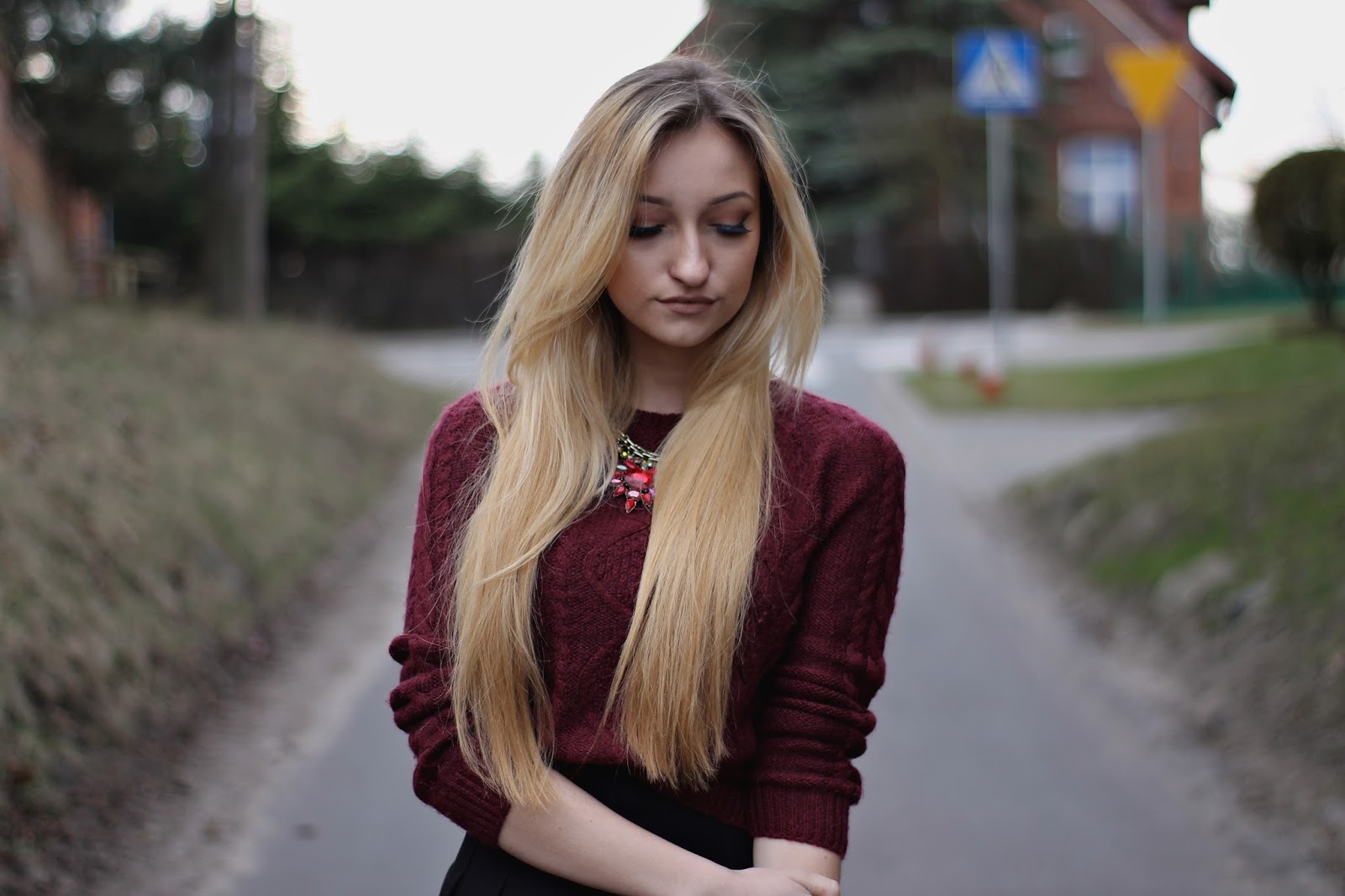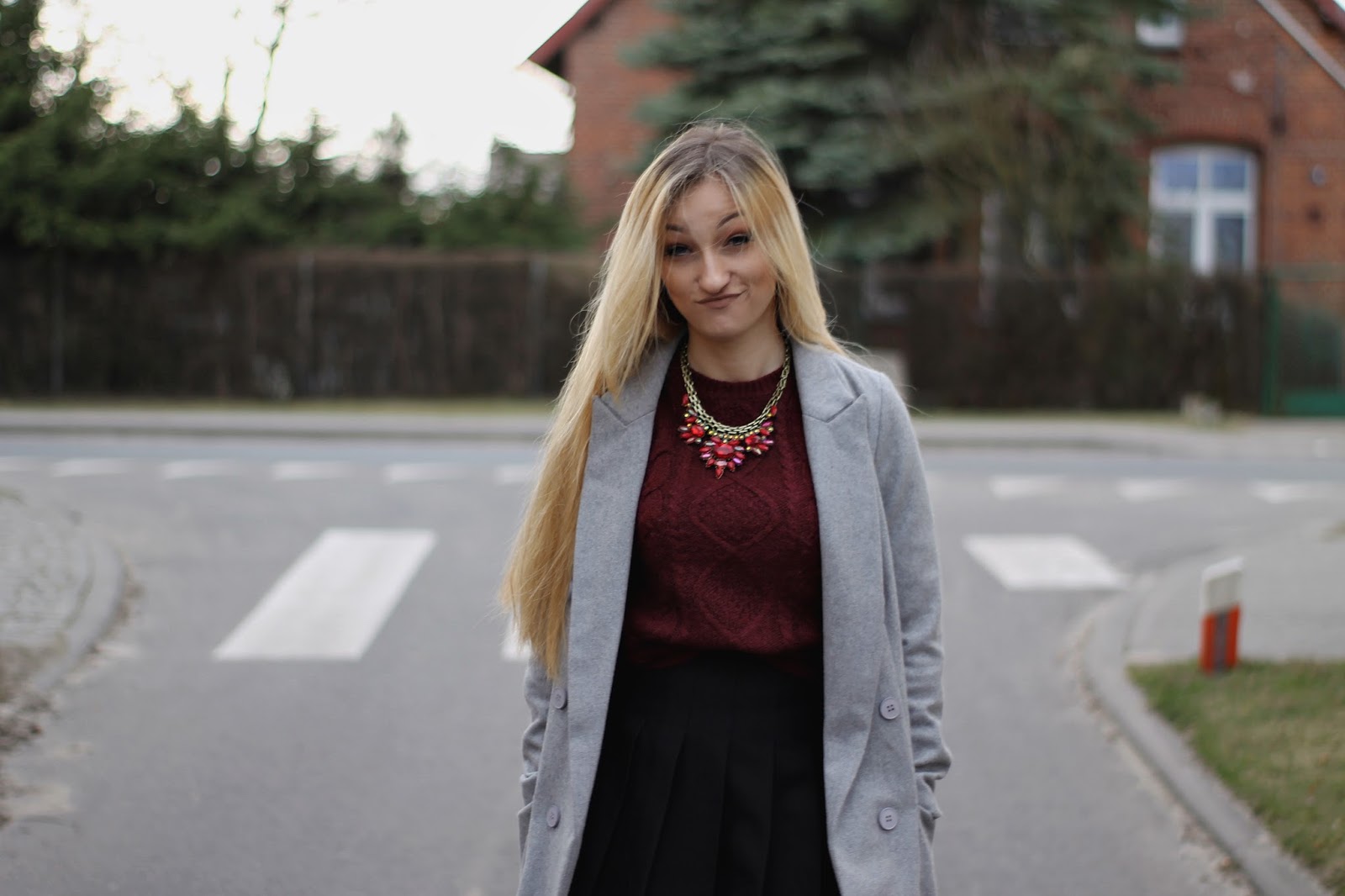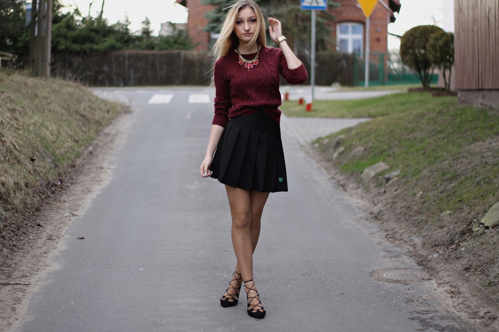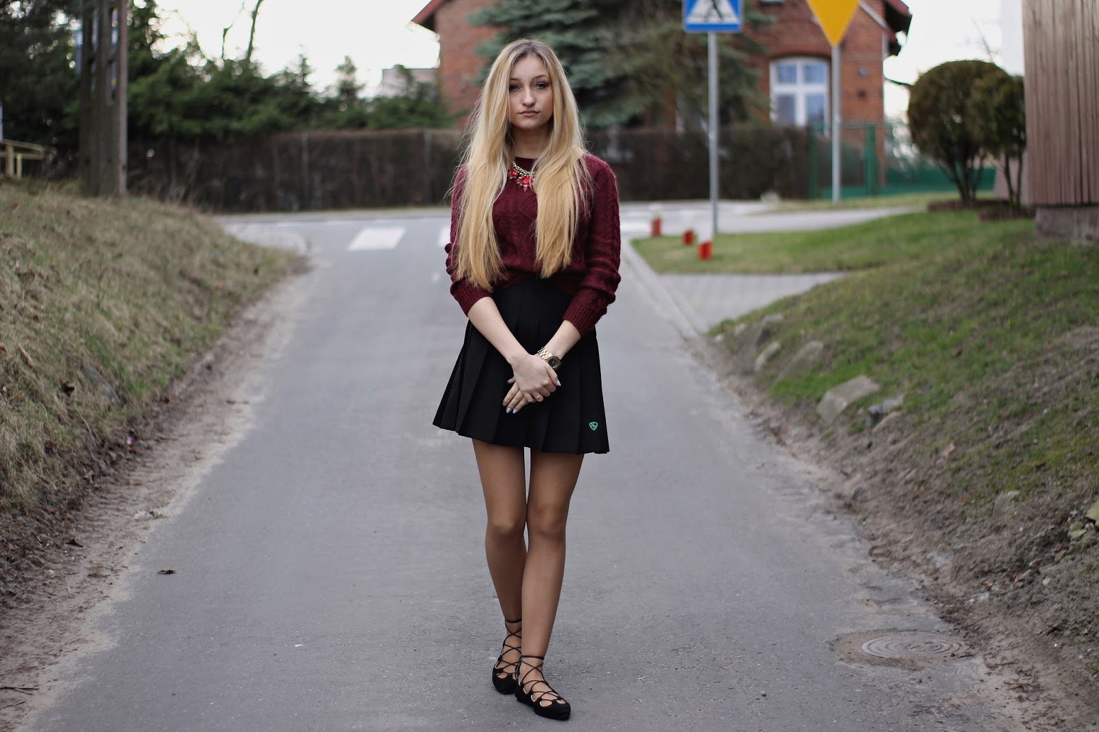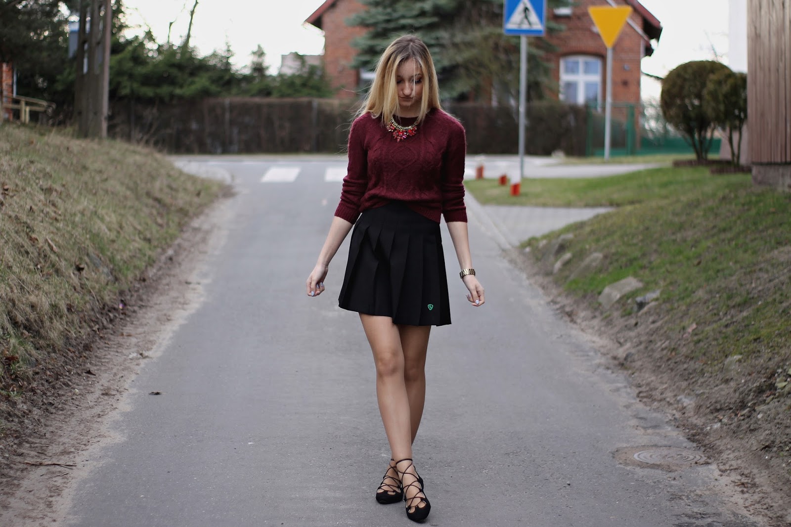Dzisiejszy post nie jest typowym wielkanocnym postem ze zdjęciem potraw i ozdób na stole. Uważam, że tego i tak na blogach jest pełno, a ja chcę pokazać wam kolejną stylizację. Mój chłopak uważa, że wyglądam jak uczennica 🙂 Może dlatego, że spódniczka to część Angielskiego mundurka. Do tego ubrałam mój bordowy sweter z Zary i cudowne wiązane baleriny z TEGO sklepu. Czy nie są piękne? Gwarantuję wam, że tej wiosny będą bardzo modne, więc tym dziewczynom, które gonią za modą gorąco polecam je już kupić. A te, które chcą je mieć tańszym kosztem polecam zrobienie ich samemu. Na youtube jest pełno toutorialów jak je zrobić. Wystarczą czarne baleriny i sznurek/rzemień.