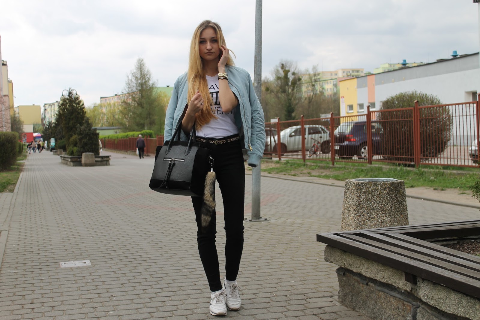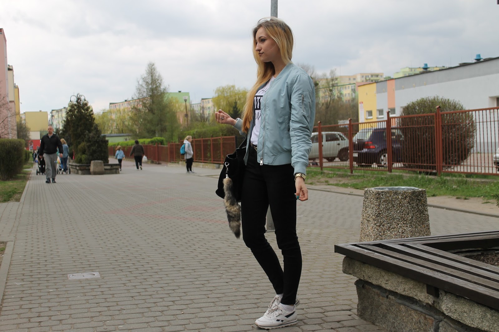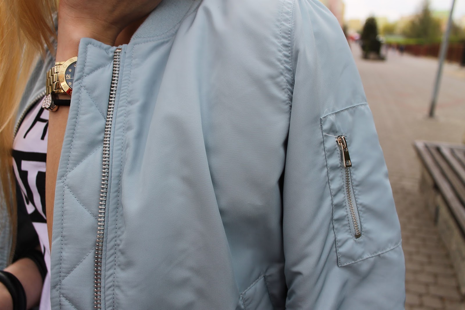 Dzisiejsza stylizacja to jedna z pierwszych bez mojego ukochanego, długiego szarego płaszcza z ROMWE. Znalazłam sobie ulubieńca na wiosnę. Mój nowiutki bomber jacket kupiłam w Stradivariusie za 99 zł i jestem z niego bardzo zadowolona! Pewnie niektóre z was widziały już te kurtki na sklepowych witrynach. Ja widziałam pikowaną czarną w New Yorkerze za 169, ale wolałam coś kolorowego. Wybór padł na serenity, aczkolwiek zastanawiałam się nad rose quartz. Nie do mnie należała decyzja, tylko do Bartka, fan wszelakiego koloru niebieskiego zabrał mi kurtkę z ręki i poszedł do kasy. Nie było czasu na zastanawianie się, bo byliśmy ostatnimi klientami w sklepie, ok. 5 min po zamknięciu centrum. Do kurtki założyłam, klasyczne czarne jeansy i moje ulubione reeboki. Skromne detale można zauważyć na ręce, przy torebce i na biodrach. Zapraszam do zdjęć.