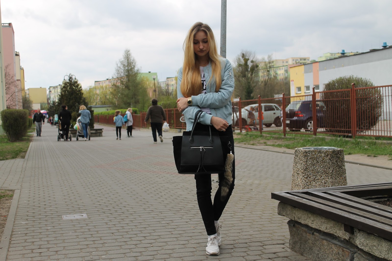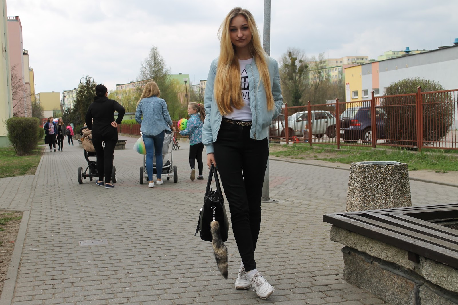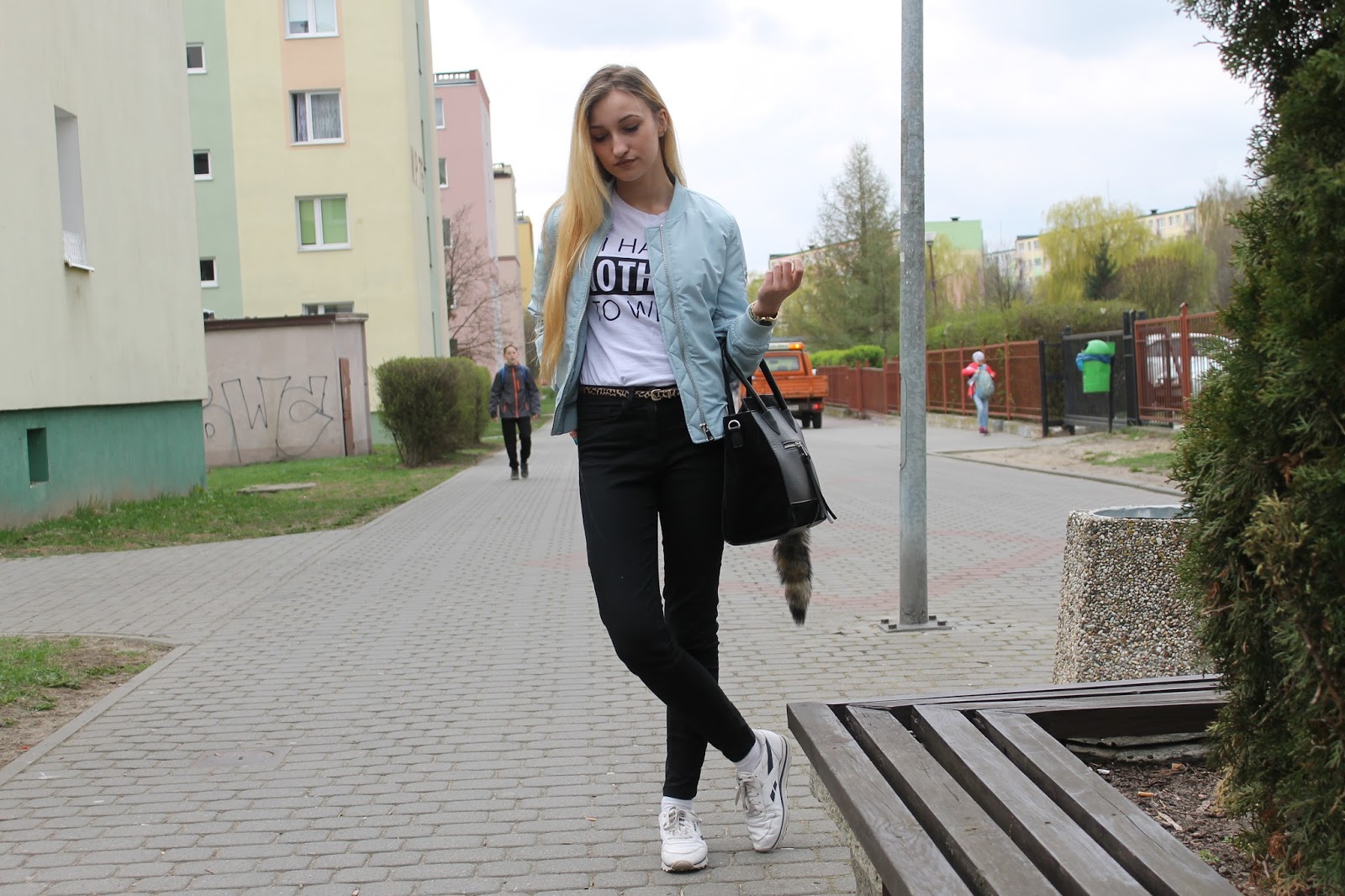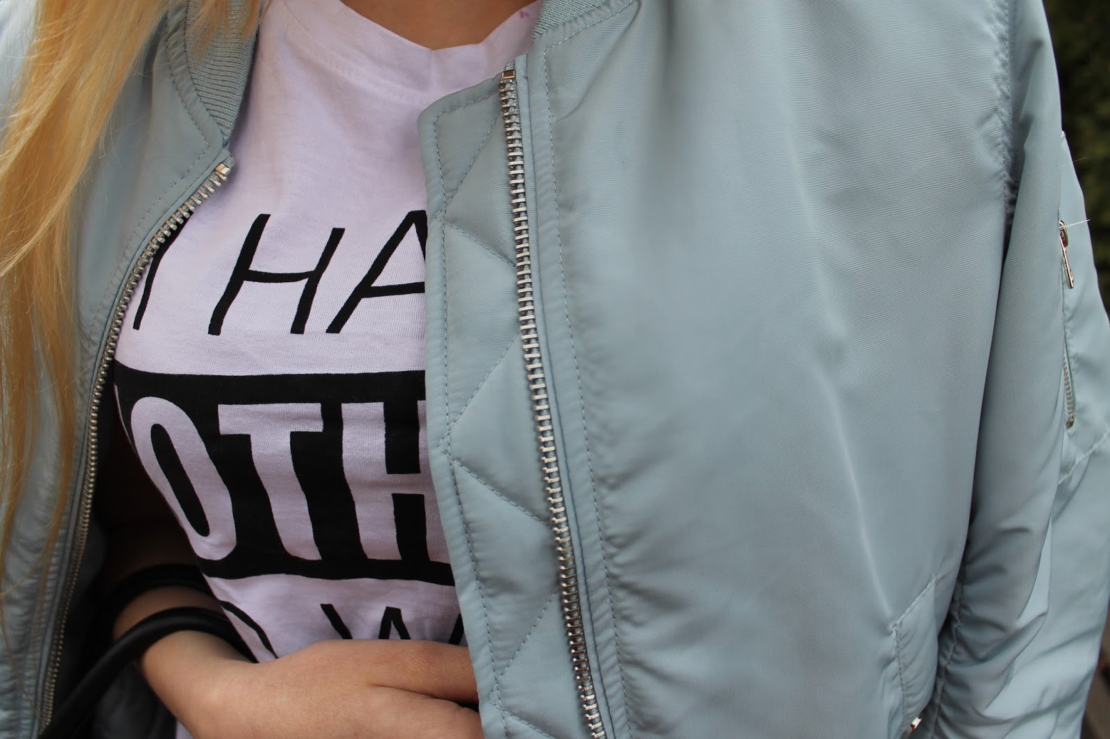 Dzisiejsza stylizacja to jedna z pierwszych bez mojego ukochanego, długiego szarego płaszcza z ROMWE. Znalazłam sobie ulubieńca na wiosnę. Mój nowiutki bomber jacket kupiłam w Stradivariusie za 99 zł i jestem z niego bardzo zadowolona! Pewnie niektóre z was widziały już te kurtki na sklepowych witrynach. Ja widziałam pikowaną czarną w New Yorkerze za 169, ale wolałam coś kolorowego. Wybór padł na serenity, aczkolwiek zastanawiałam się nad rose quartz. Nie do mnie należała decyzja, tylko do Bartka, fan wszelakiego koloru niebieskiego zabrał mi kurtkę z ręki i poszedł do kasy. Nie było czasu na zastanawianie się, bo byliśmy ostatnimi klientami w sklepie, ok. 5 min po zamknięciu centrum. Do kurtki założyłam, klasyczne czarne jeansy i moje ulubione reeboki. Skromne detale można zauważyć na ręce, przy torebce i na biodrach. Zapraszam do zdjęć.