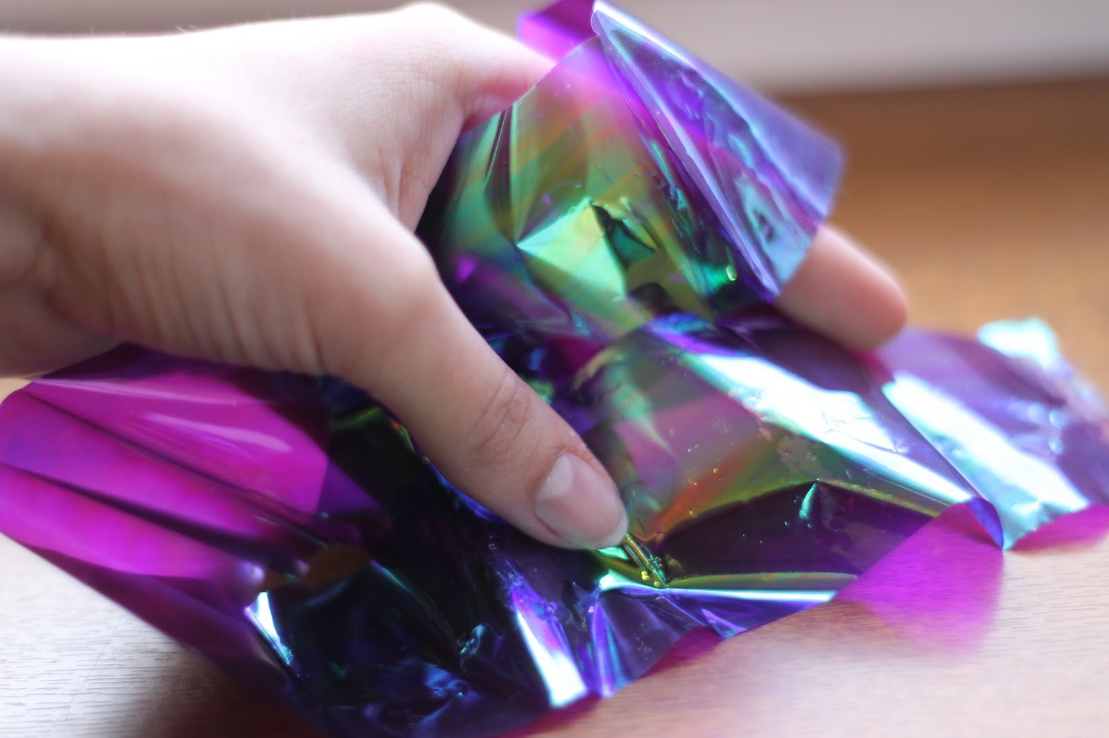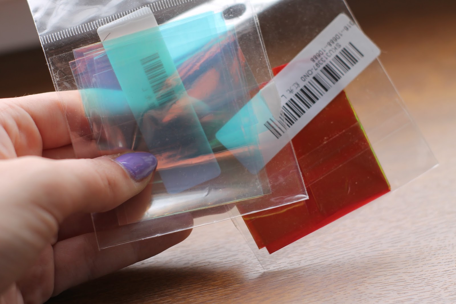 Efet szkła w kolorze zielonym, czerwonym i aurora. Ta folia jest bardzo gruba, łatwo się ją aplikuje na paznokieć, ale ciężko pokryć top coat’em. Mimo to jest świetn, polecam bardzo, bo kosztuje grosze. KLIK